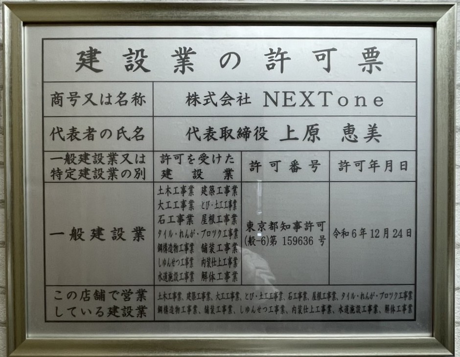 株式会社NEXToneは、2023年5月に法人設立、2024年12月に建設業許可を取得した、店舗.オフィスリノベーション専門の建設会社です。